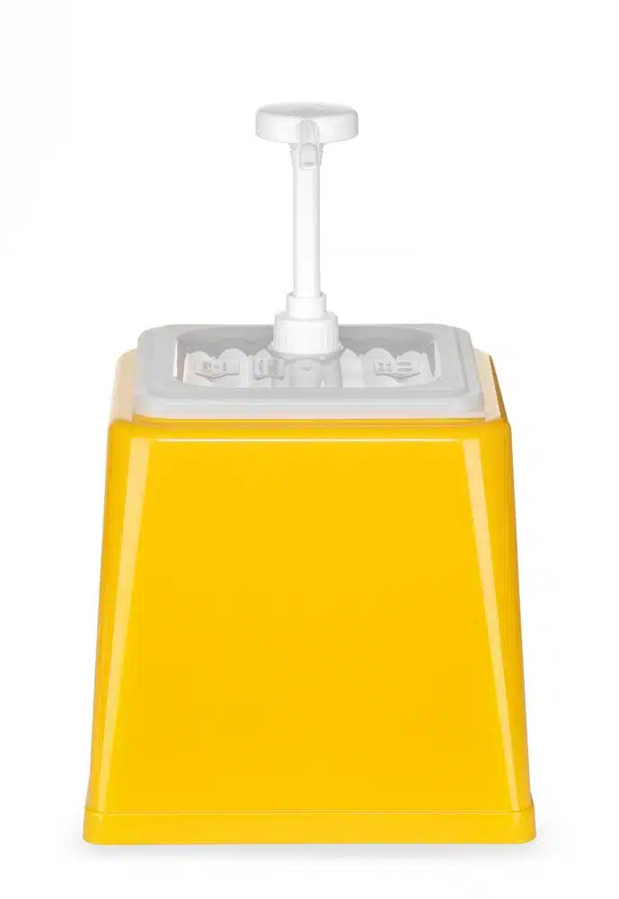 Saucenbehälter mit Messskala, Deckel und abnehmbarer Pumpe, alles aus Polypropylen.