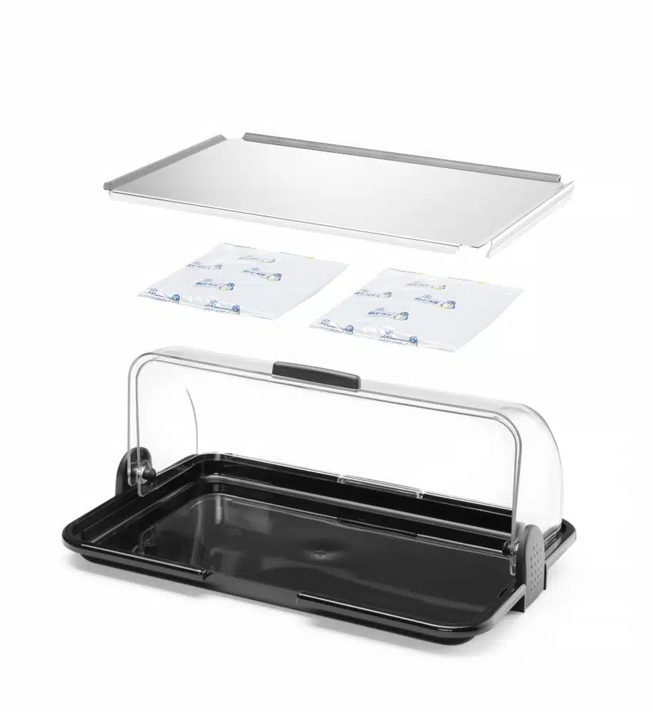 Das Set enthält 2 Gel-Einsätze zum Kühlen oder Erwärmen von Lebensmitteln, die in das Display gelegt werden.
