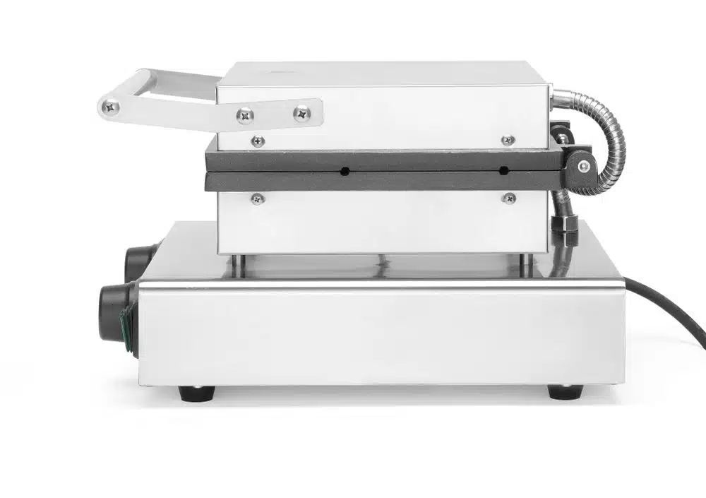 In das Waffeleisen sind Rillen eingefräst, so dass man den Stock einführen und das Waffeleisen trotzdem schließen kann.
